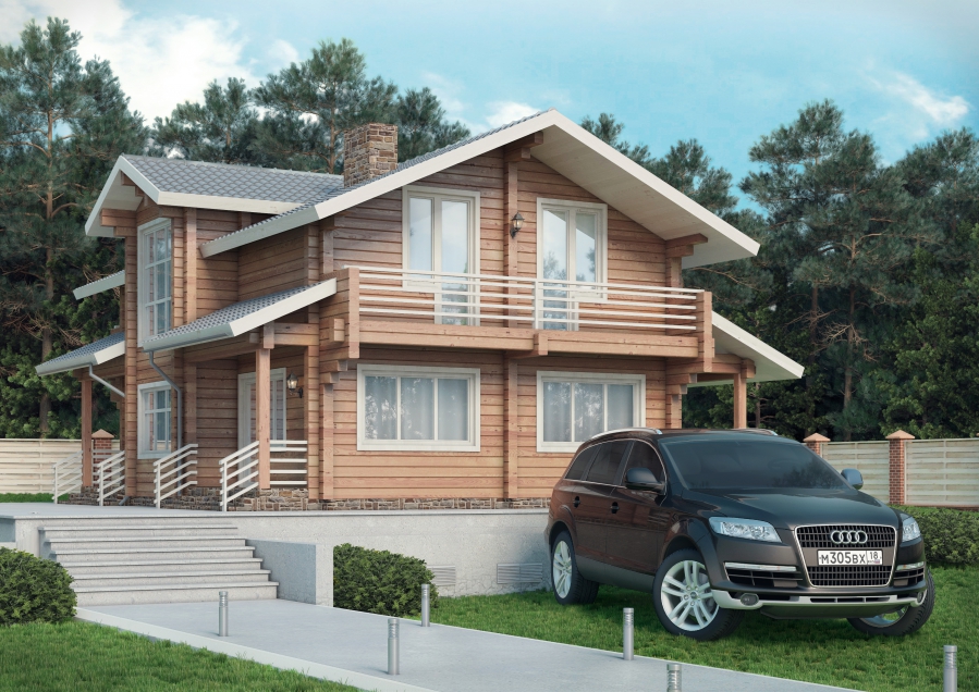 2-х этажный коттедж с обоснованной прилагающей территорией. Визуализация с реалистичными настройками фона, материалов и освещения.