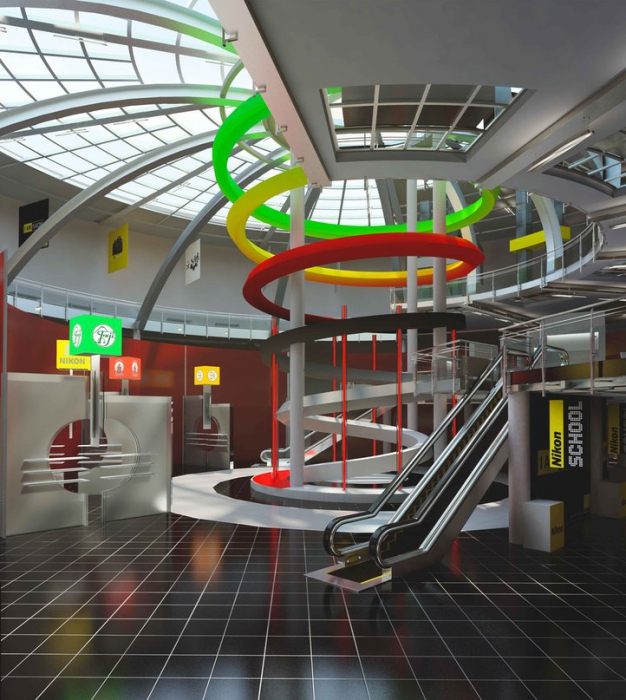 В данном примере демонстрируется галерея без наполнения, заказанная студентом. Требовалось изменить текстуры и настроить свет, используя предоставленную сцену. Проект использовался для печати на дипломном планшете. Стоимость подобного проекта зависит от количества площади, а так же качества материалов.
